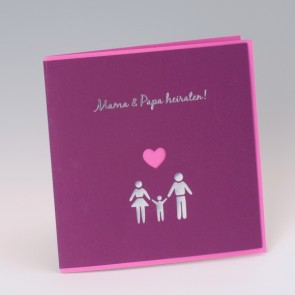 Aber diese Einladung ist nur eine von vielen in unseren Kartenshop. Unser Angebot umfasst eine ganze Reihe hochwertiger Hochzeitseinladungen, in der die neue Familie im Mittelpunkt steht. Ganz witzig sind auch die Karten, bei der mehr oder weniger IHR Kind zur Hochzeit seiner Eltern einlädt, eine Babyhand abgebildet ist oder die ganze Familie im Cabrio unterwegs ist. Unter dem Motto "Mama und Papa heiraten" können wir auch einiges anbieten, wie die Karte in der linken Spalte zeigt. Aber sehen Sie selbst: Lassen Sie sich Zeit bei der Durchsicht - es lohnt sich!